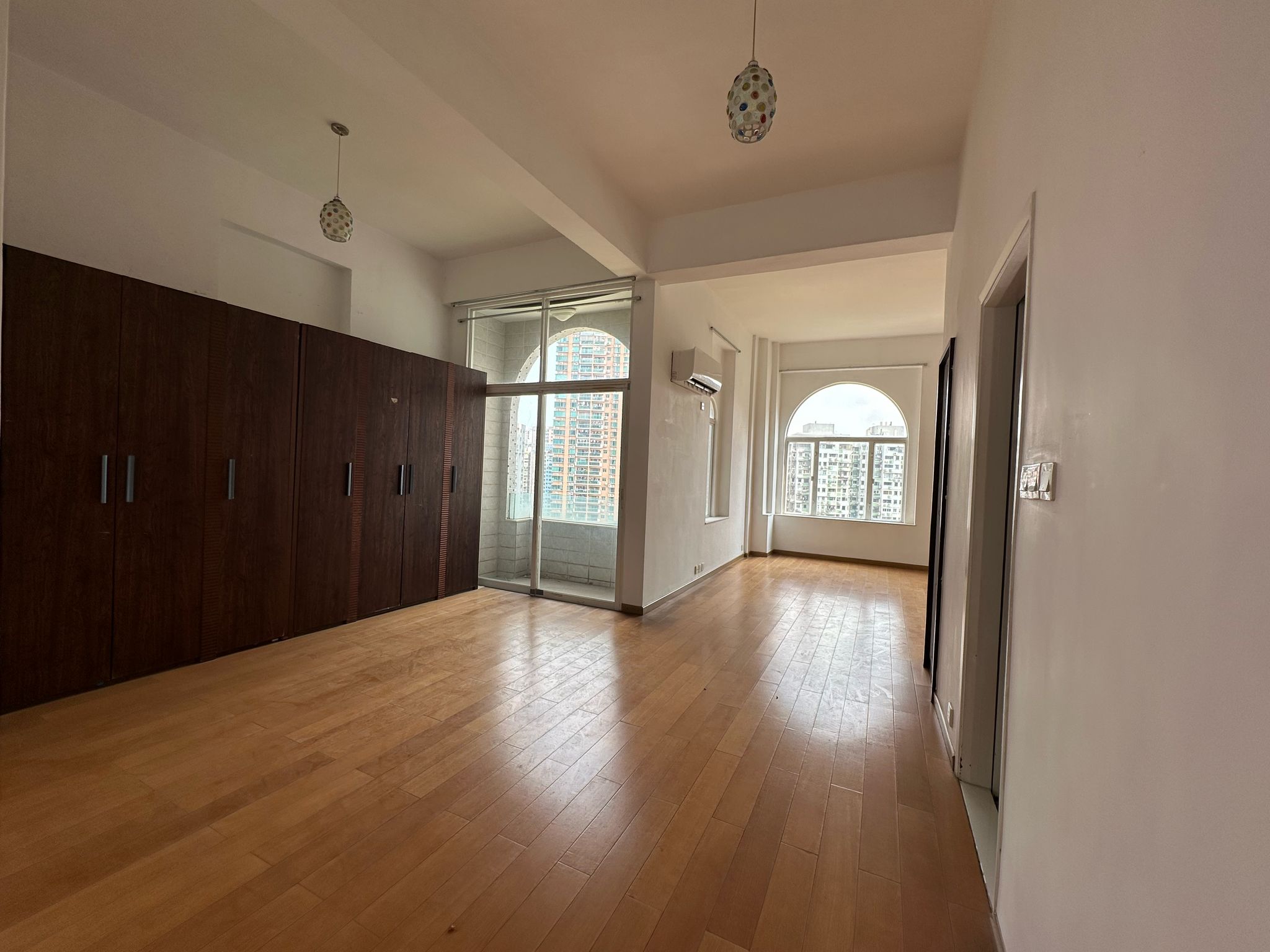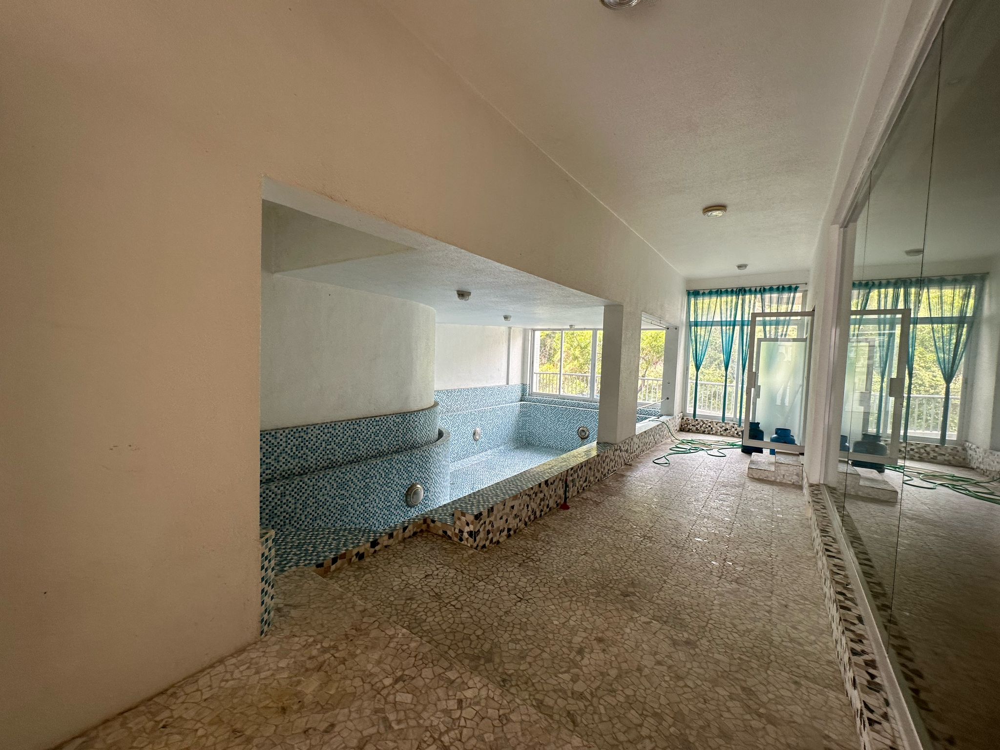 ~ Living room with large balcony, there is an indoor swimming pool next to the dining room